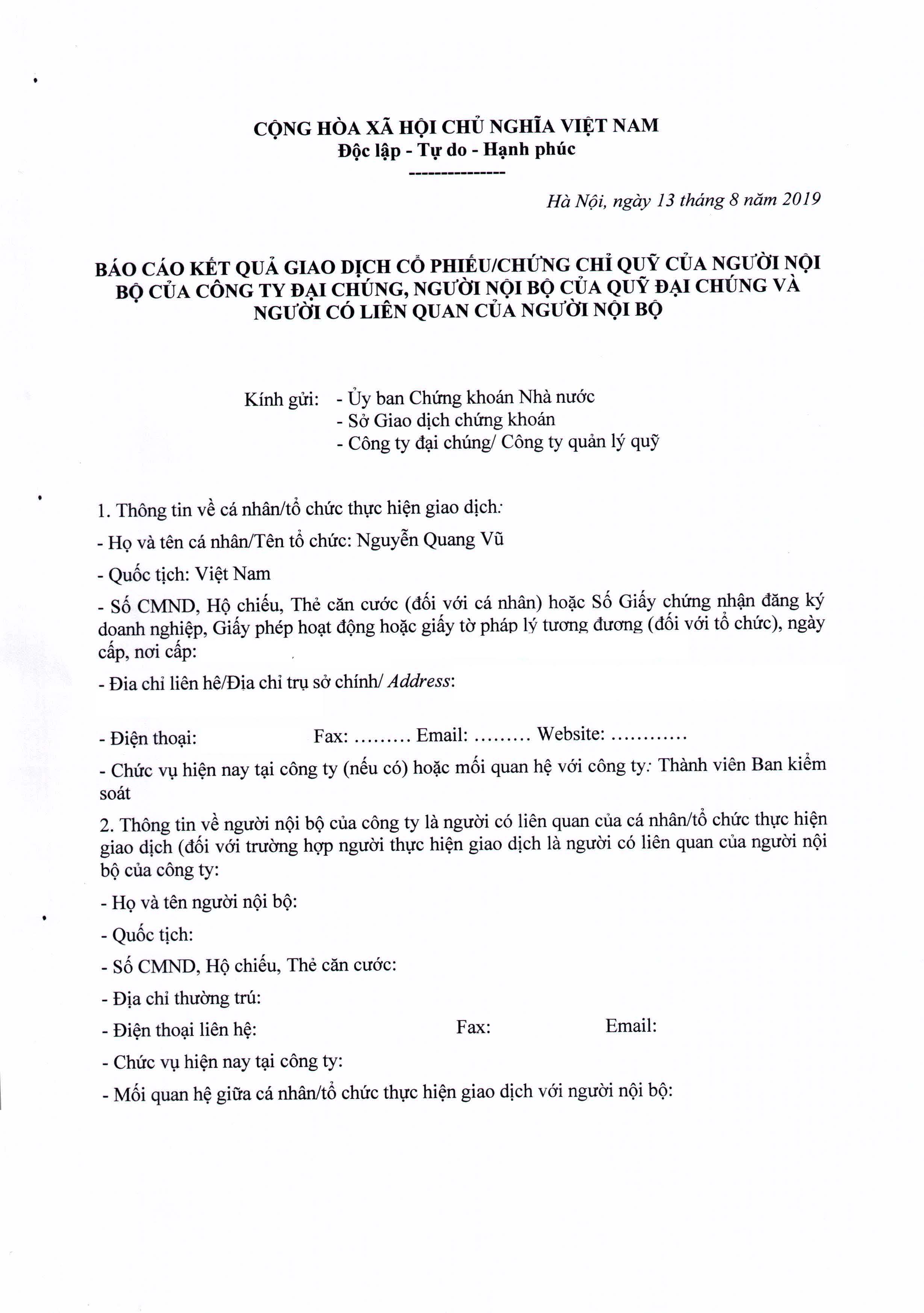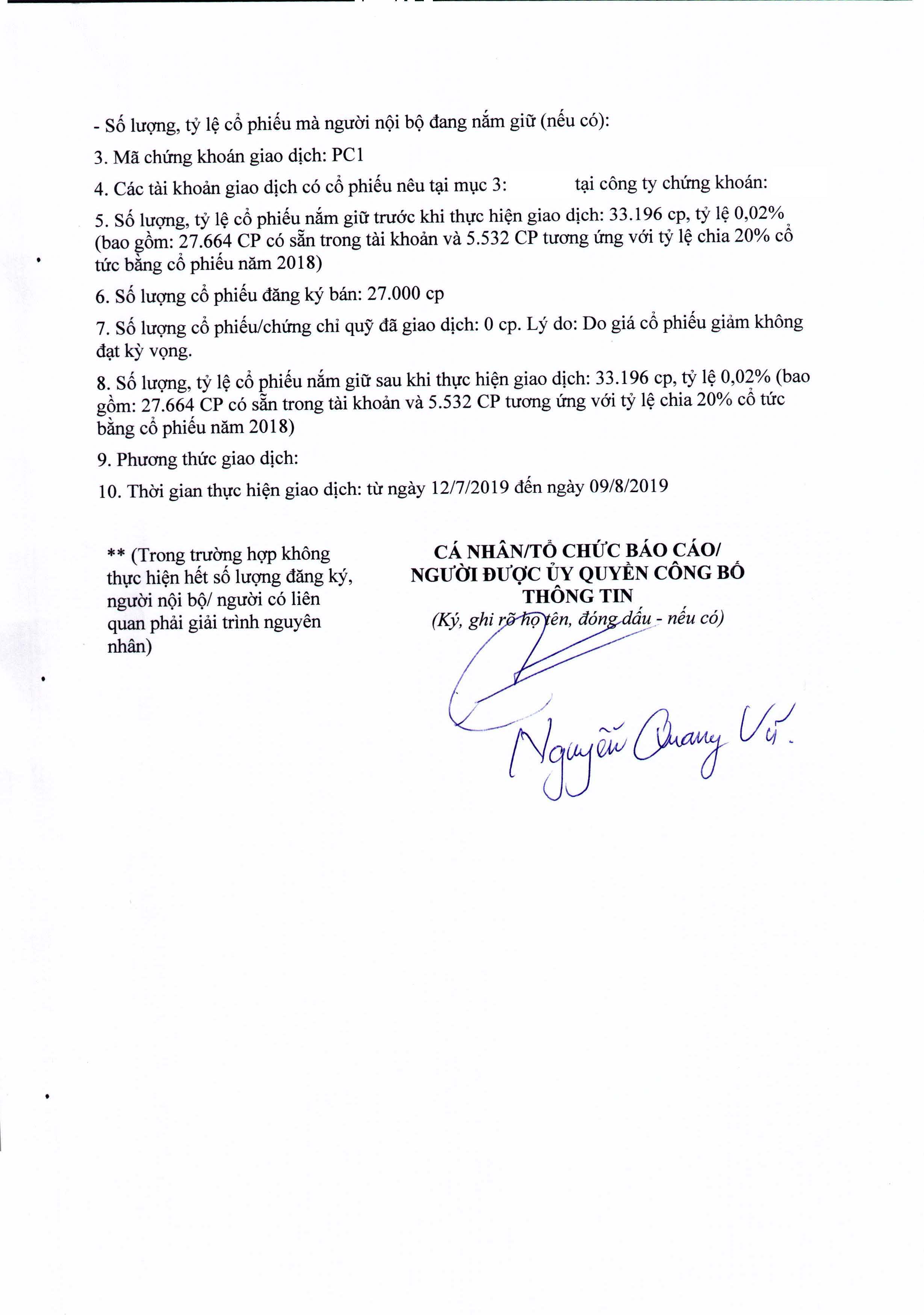 Công ty cổ phần xây lắp điện 1 (PCC1) công bố thông tin “Báo cáo kết quả giao dịch cổ phiếu của người nội bộ - Ông Nguyễn Quang Vũ TV.BKS”