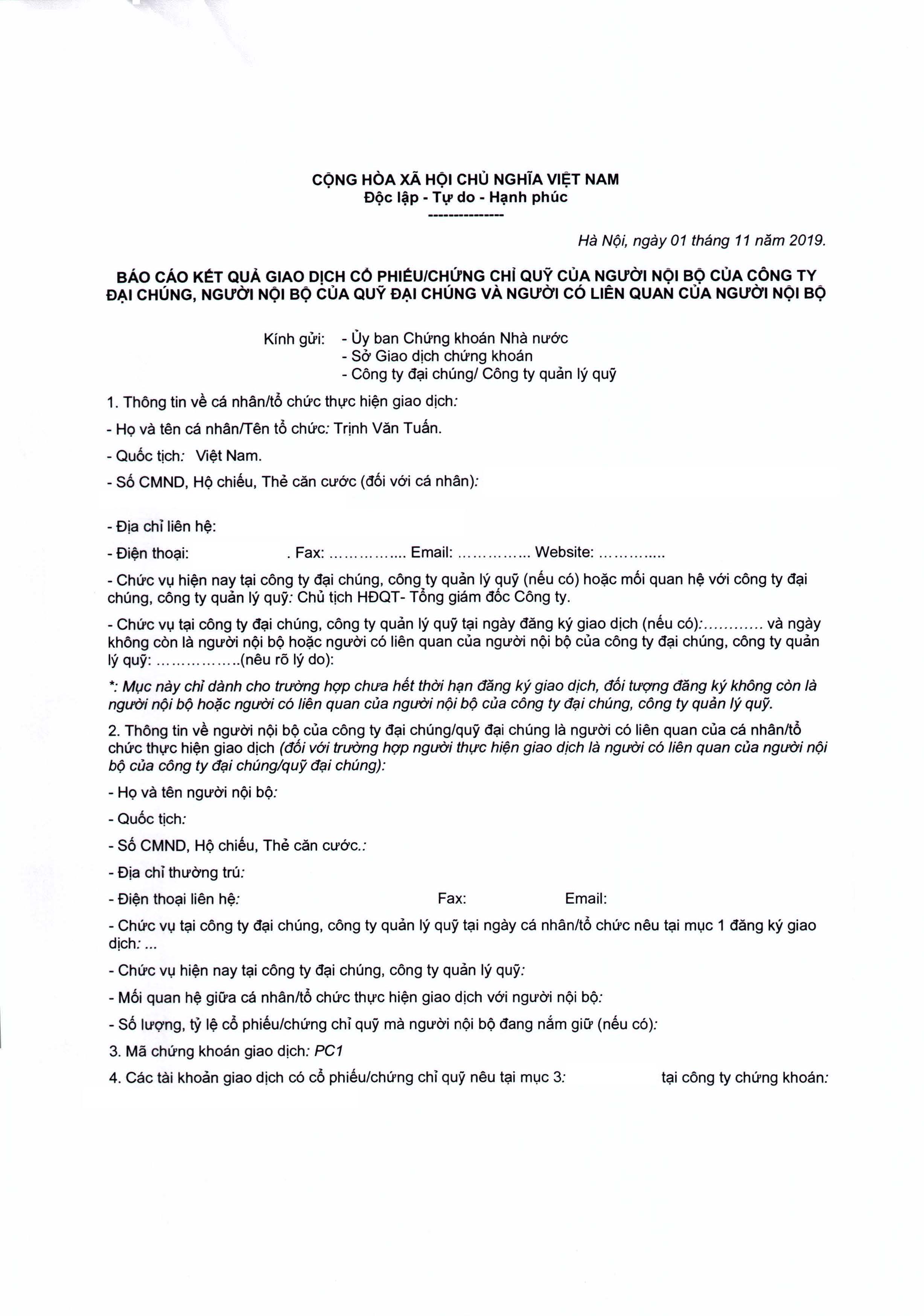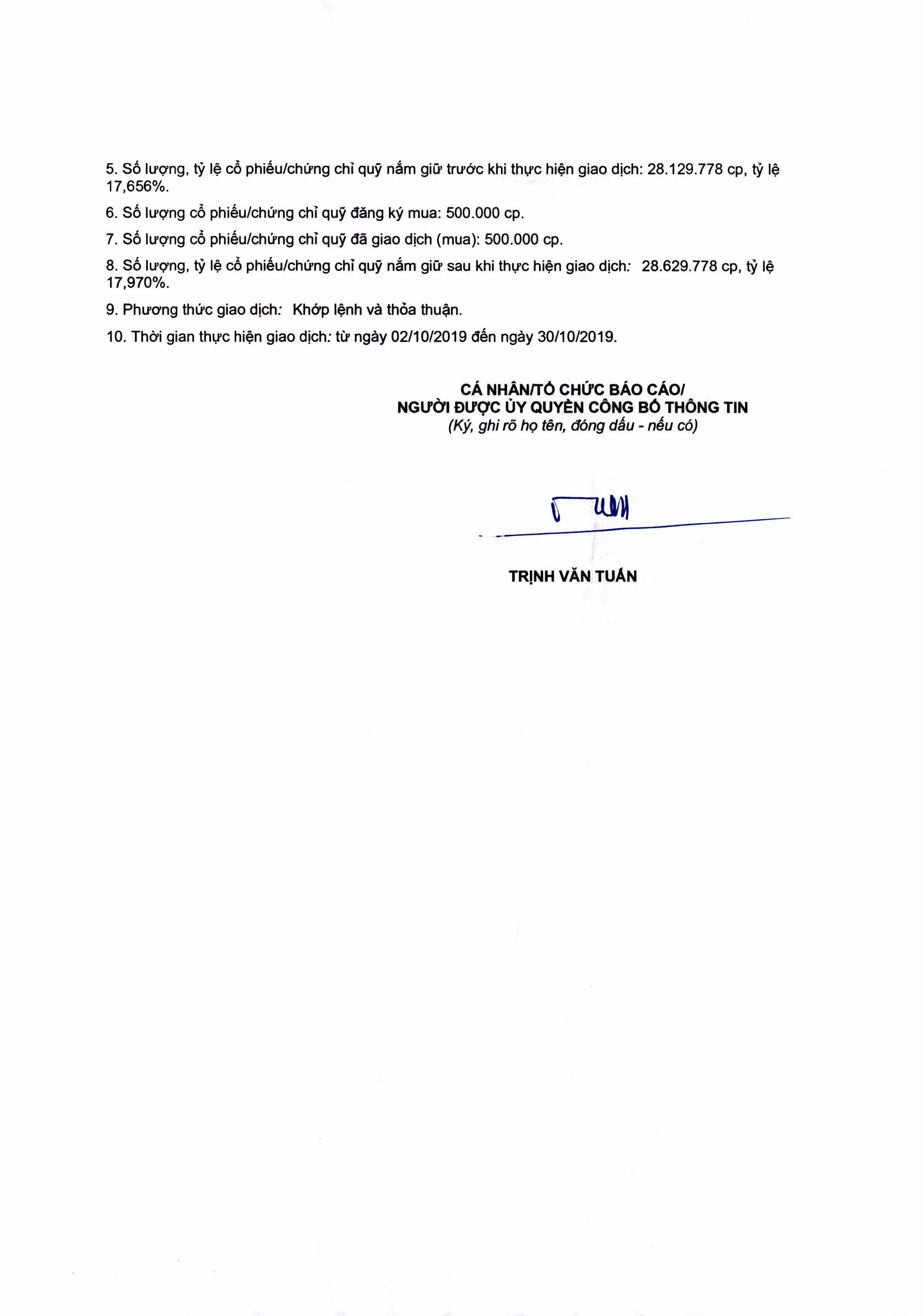 Báo cáo kết quả giao dịch cổ phiếu của người nội bộ: Ông Trịnh Văn Tuấn - CT HĐQT, TGĐ Công ty