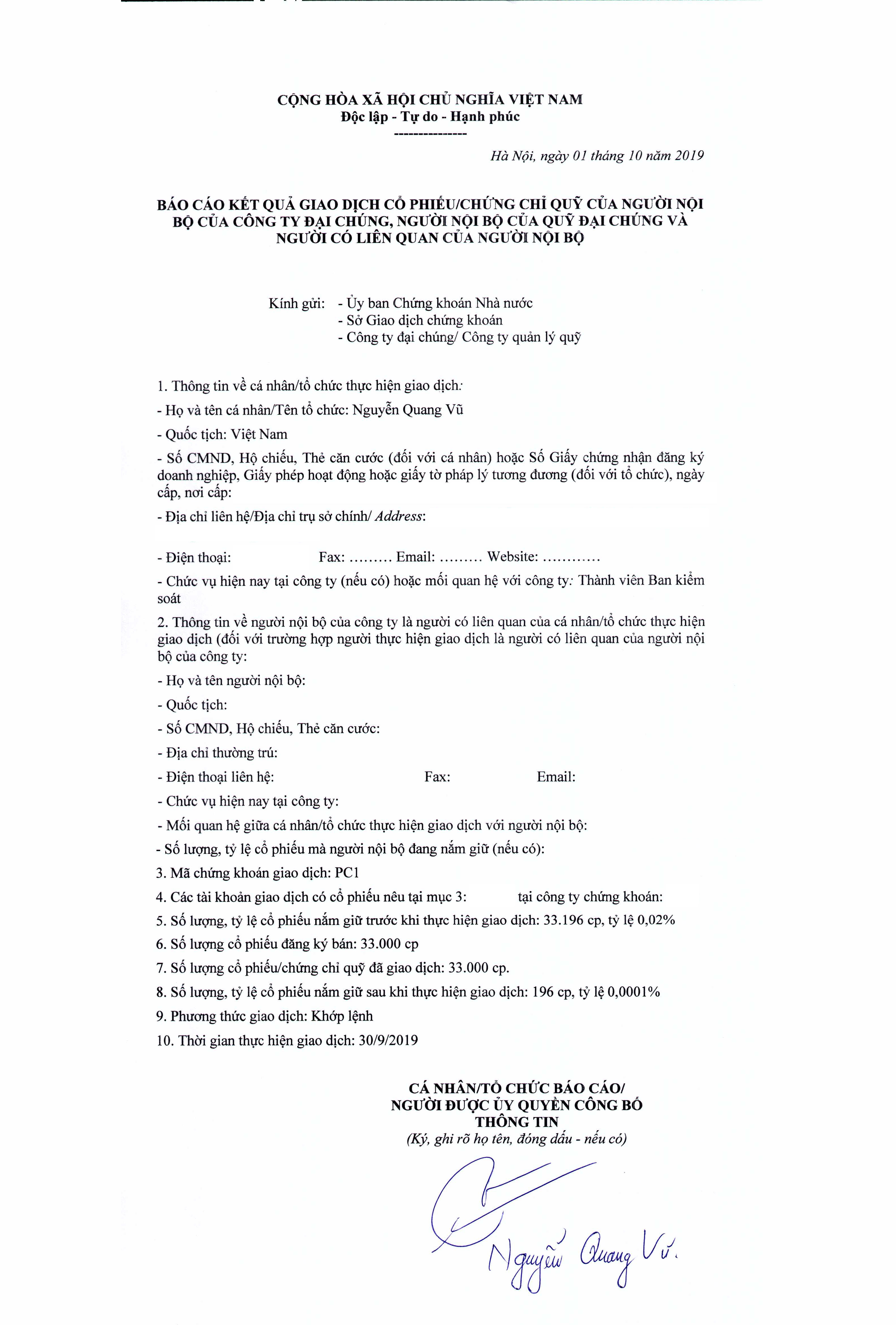 Báo cáo kết quả giao dịch của người nội bộ: Ông Nguyễn Quang Vũ – TV BKS