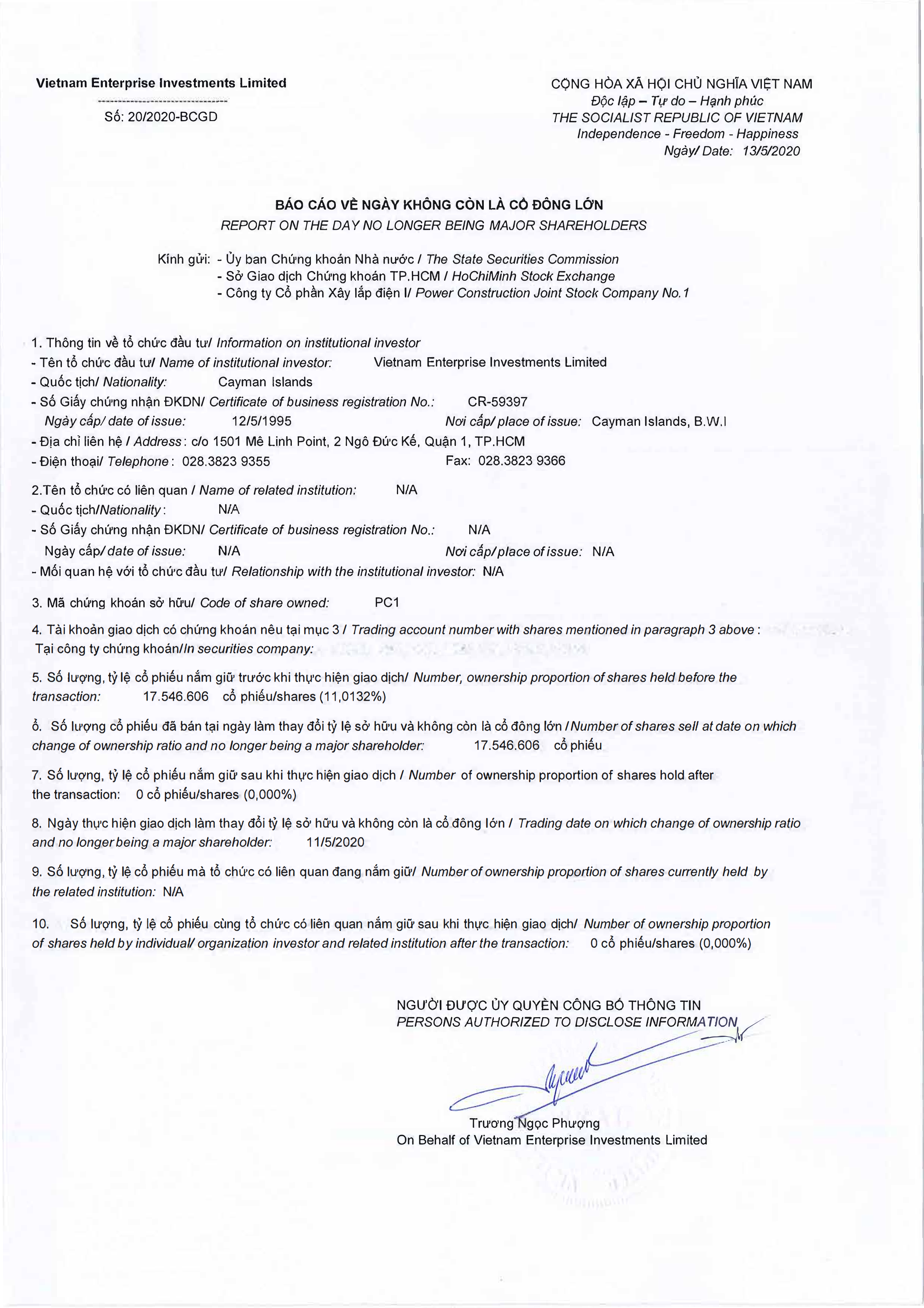 Kính gửi các quý cổ đông của Công ty cổ phần xây lắp điện I (PCC1). PCC1 xin gửi tới quý cổ đông bản Báo cáo Báo cáo về ngày không còn là cổ đông lớn Vietnam Enterprise Investments Limited Quý cổ động xem và tải về tại đây. /upload/store/uploads/2020/05/20200514-PC1-BC-khong-con-la-CD-lon-Vietnam-Enterprise-Investments-Limited_001.png