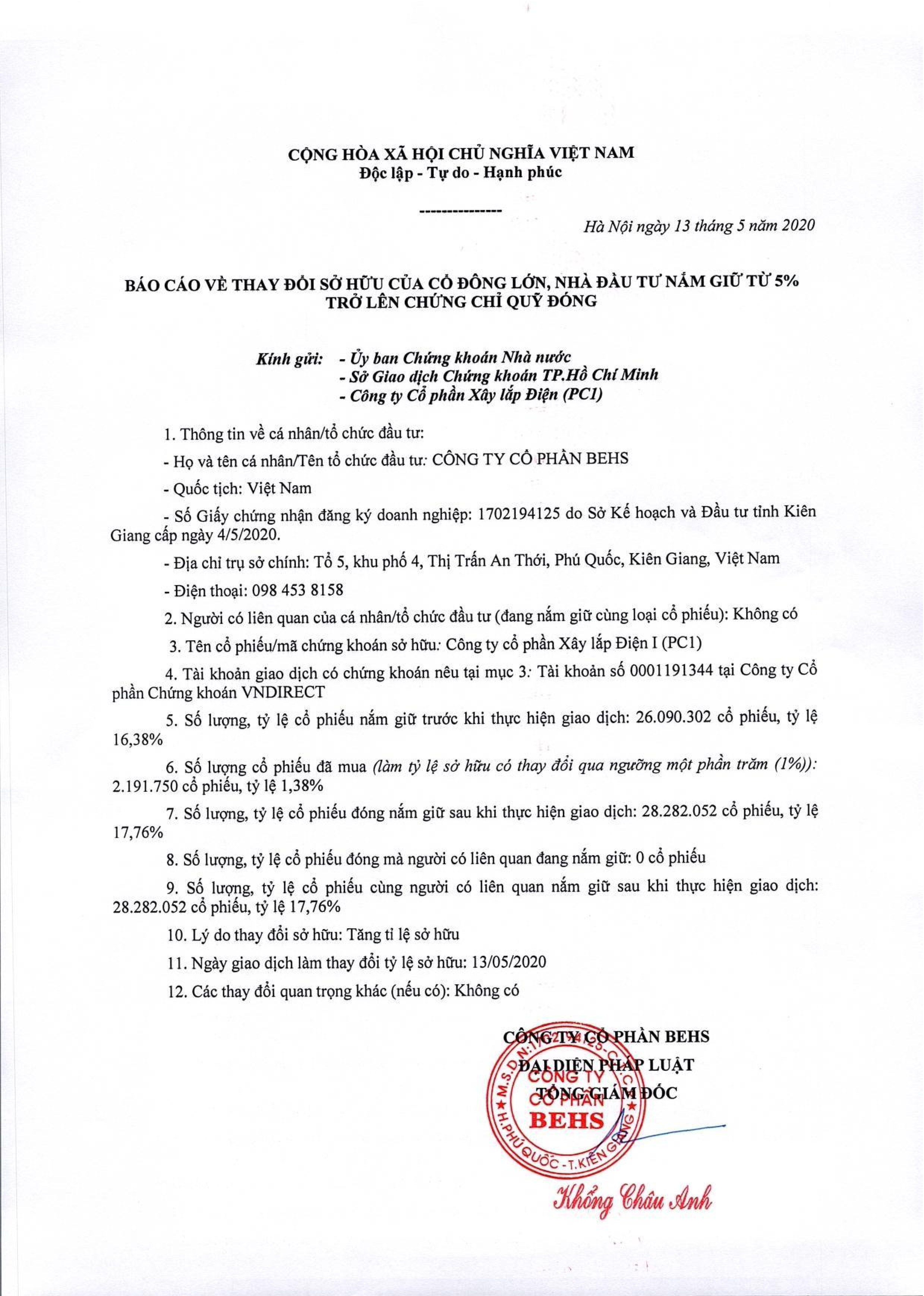 Kính gửi các quý cổ đông của Công ty cổ phần Xây lắp điện I (PCC1). PCC1 xin gửi tới quý cổ đông bản Báo cáo về ngày trở thành cổ đông lớn CTCP BEHS Quý cổ động xem và tải về tại đây. /upload/store/uploads/2020/05/20200515-PC1-Bao-cao-tro-thanh-CD-lon-CTCP-BEHS_002.png