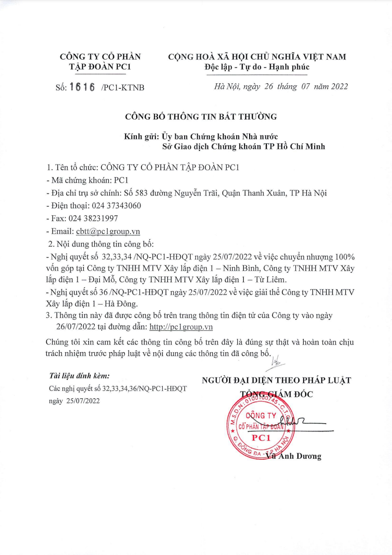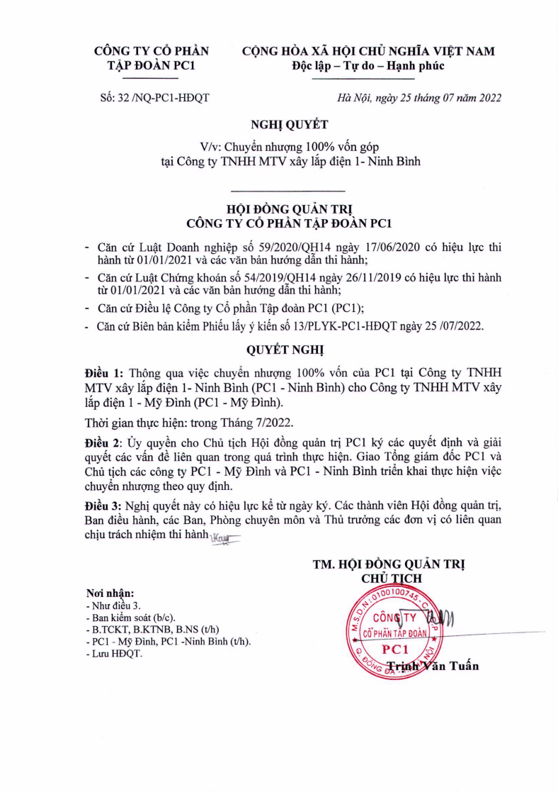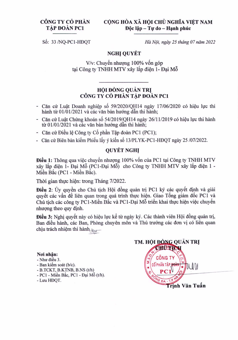 CBTT Nghị quyết HĐQT về việc giải thể và chuyển nhượng vốn tại các công ty thành viên Xây lắp điện Link: 20220726 - PC1 - CBTT Nghi quyet HDQT vv giai the va chuyen nhuong von tai cac cong ty thanh vien Xay lap dien_signed