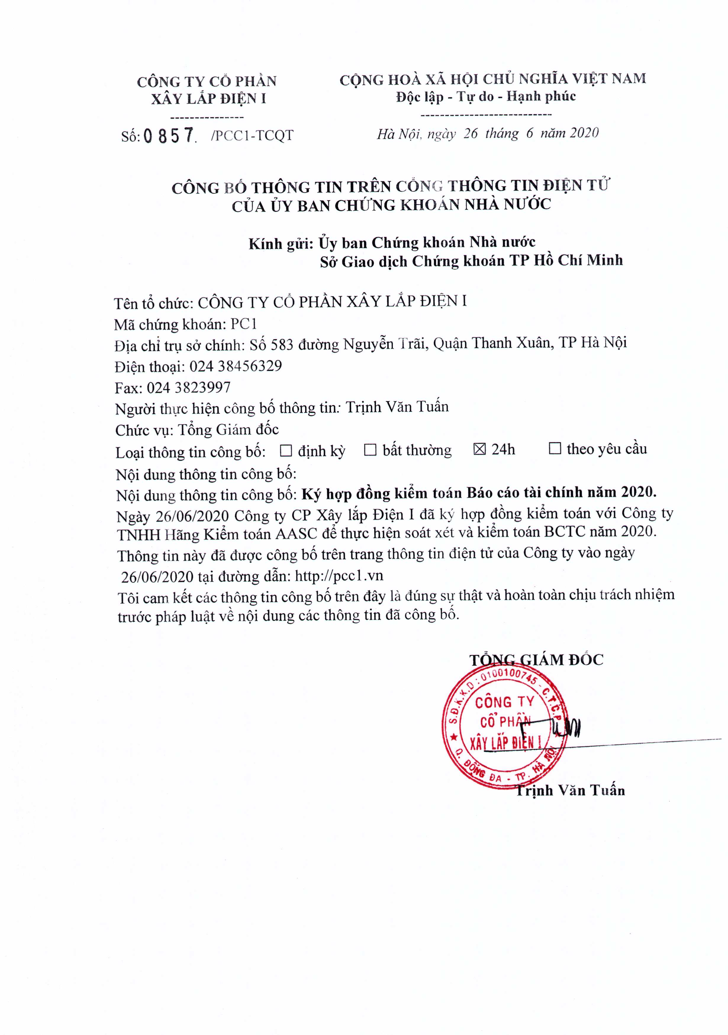 PCC1 xin gửi tới quý cổ đông: Ký hợp đồng kiểm toán Báo cáo tài chính năm 2020