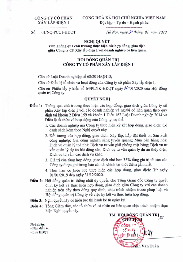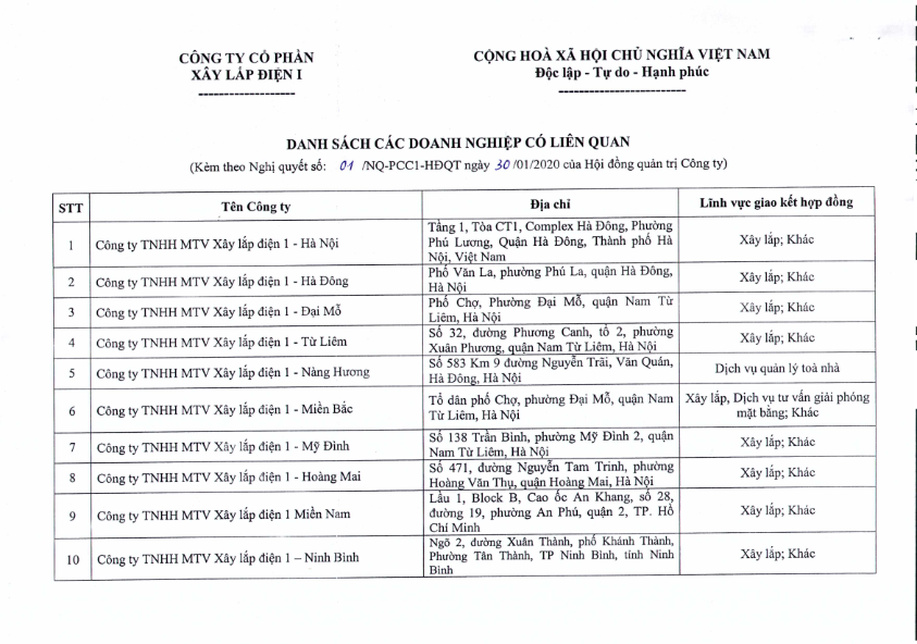 Kính gửi Quý cổ đông, quý khách hàng và quý đối tác! Công ty cổ phần xây lắp điện 1 (PCC1) công bố thông tin “Nghị quyết của HĐQT về việc Thông qua chủ trương thực hiện các hợp đồng, giao dịch giữa Công ty CP Xây lắp điện I với doanh nghiệp có liên quan.” Vui lòng xem và tải về
