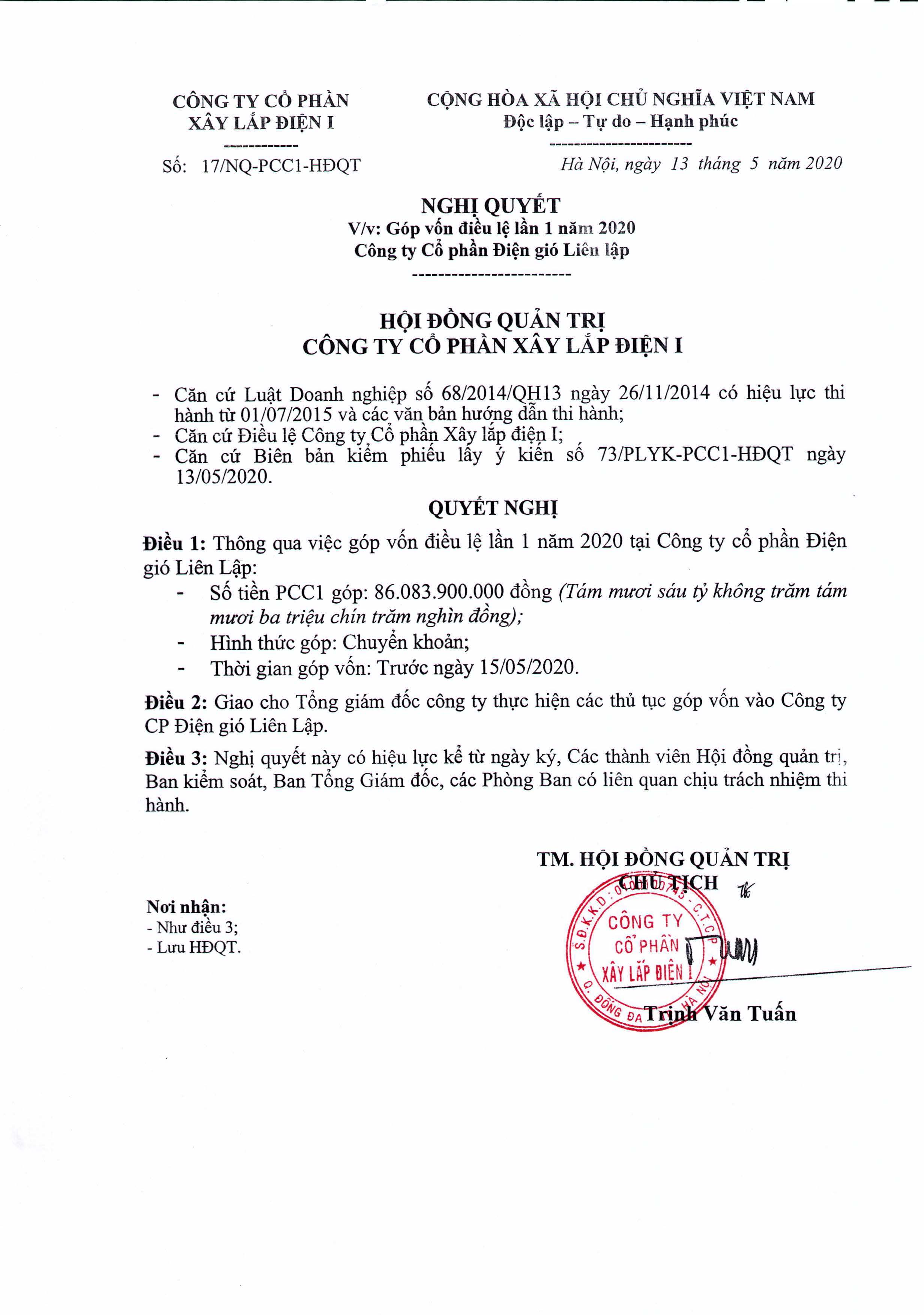 Nghị quyết HĐQT v/v: Góp vốn điều lệ lần 1 năm 2020- Công ty Cổ phần Điện Gió Liên Lập