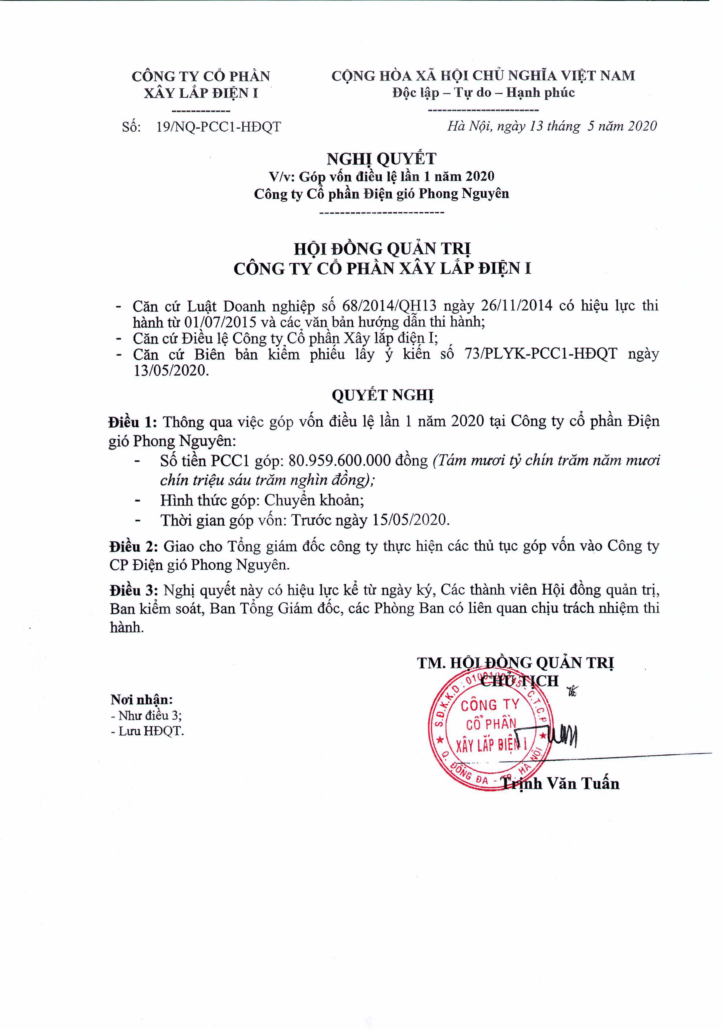 Nghị quyết HĐQT v/v: Góp vốn điều lệ lần 1 năm 2020- Công ty Cổ phần Điện Gió Phong Nguyên