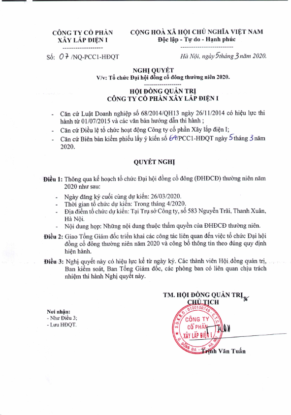 PCC1- Nghị quyết tổ chức đại hội đồng cổ đông thường niên 2020
