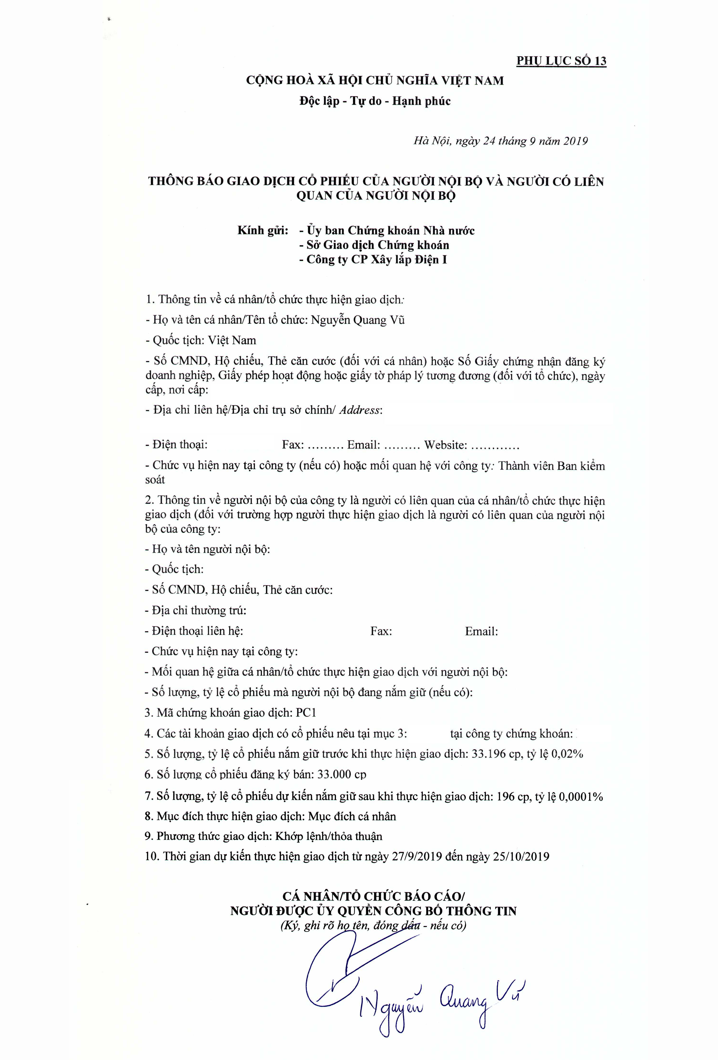 PCC1 xin gửi tới quý cổ đông bản Thông báo giao dịch cổ phiếu của người nội bộ.