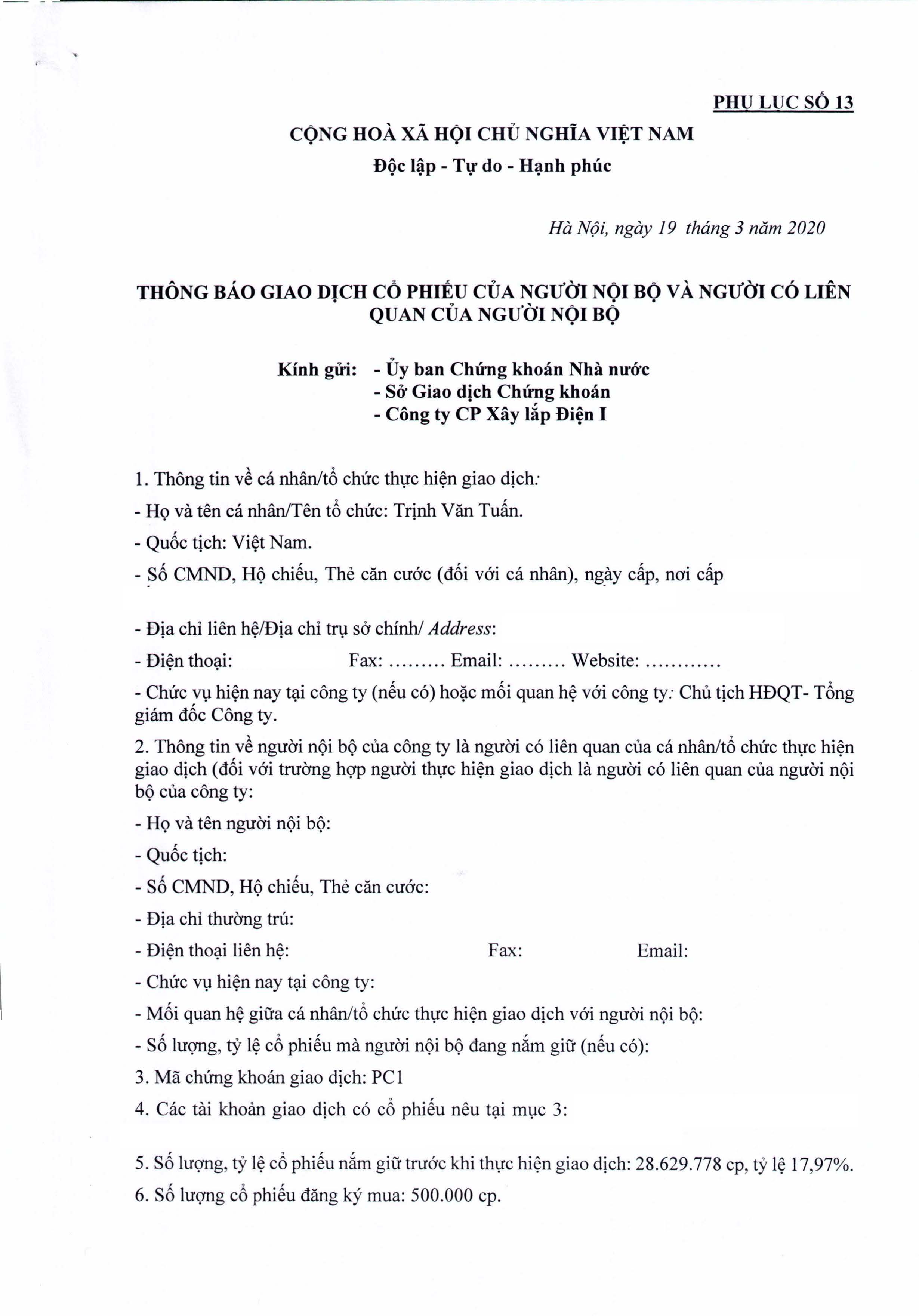 Kính gửi các quý cổ đông của Công ty cổ phần xây lắp điện I (PCC1). PCC1 xin gửi tới quý cổ đông bản Thông báo giao dịch cổ phiếu của người nội bộ. Quý cổ động xem và tải về tại đây.