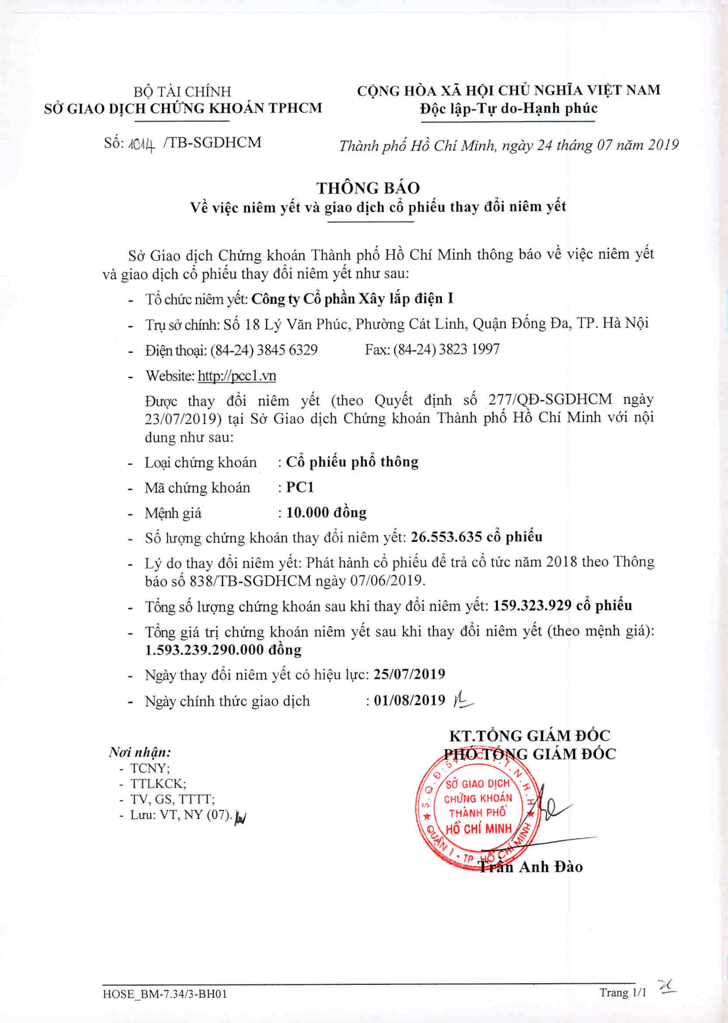 Công ty cổ phần xây lắp điện 1 (PCC1) công bố thông tin “Thông báo về việc niêm yết và giao dịch cổ phiếu thay đổi niêm yết”