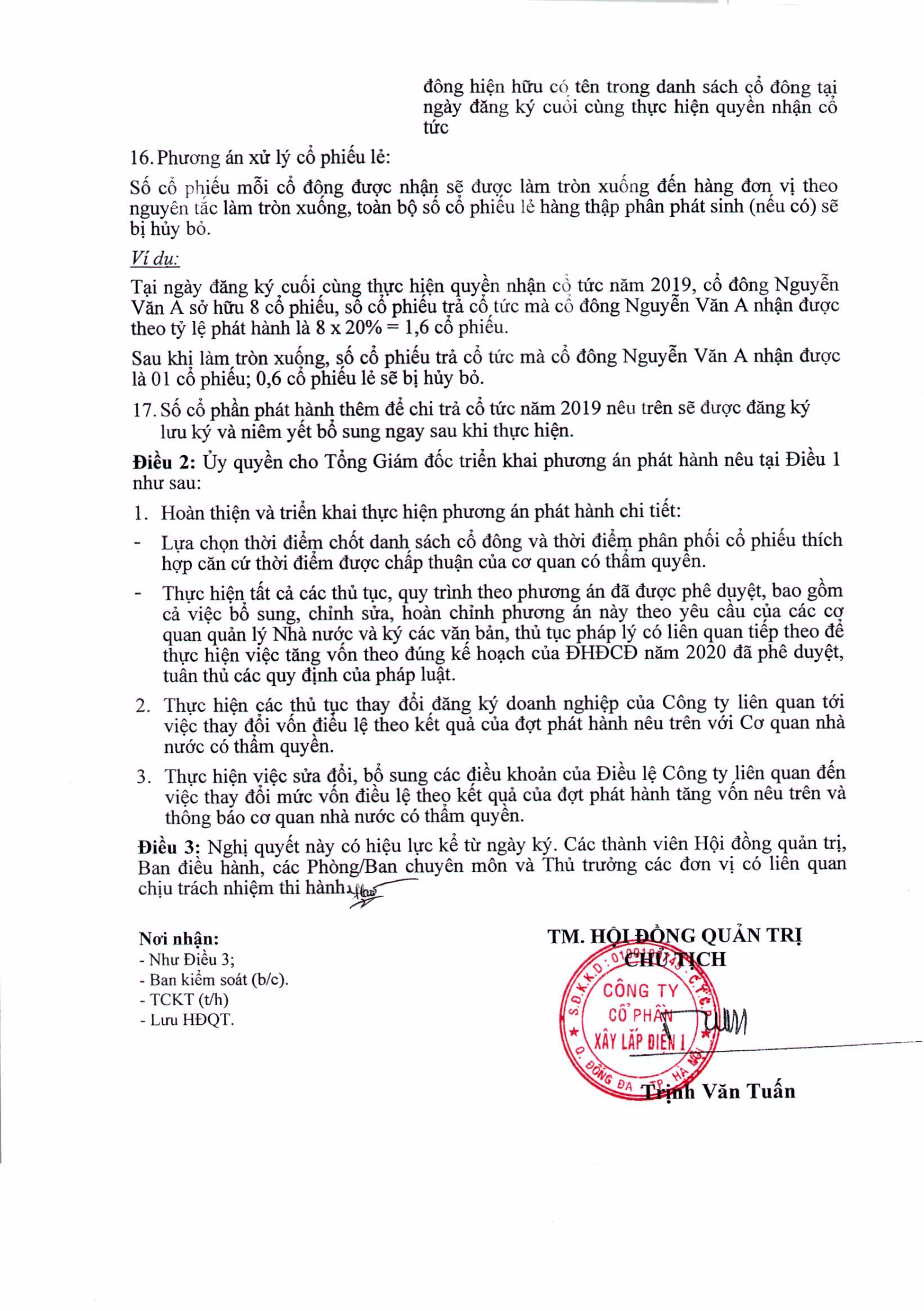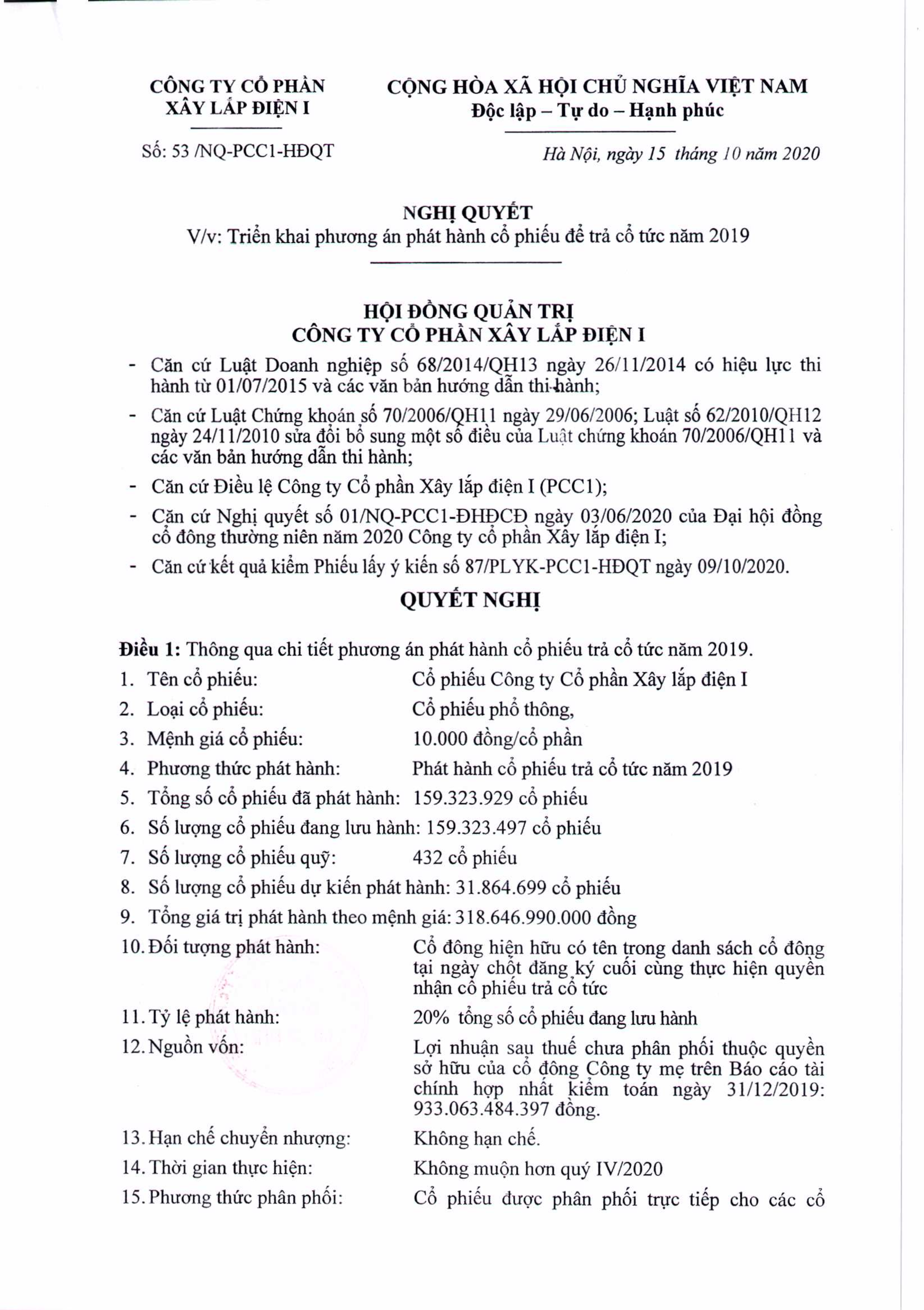 PCC1 xin gửi tới quý cổ đông: Nghị quyết của HĐQT về việc triển khai phương án phát hành cổ phiếu để trả cổ tức năm 2019
